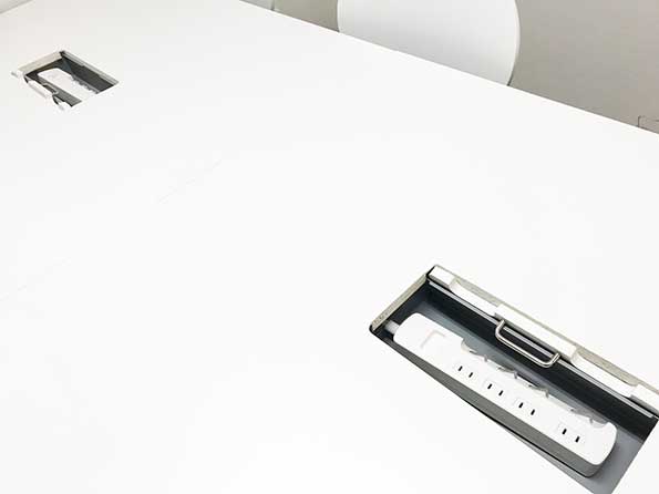電源タップが収納された配線ボックス付きの大きなテーブルがあり、会議にピッタリな店舗です。